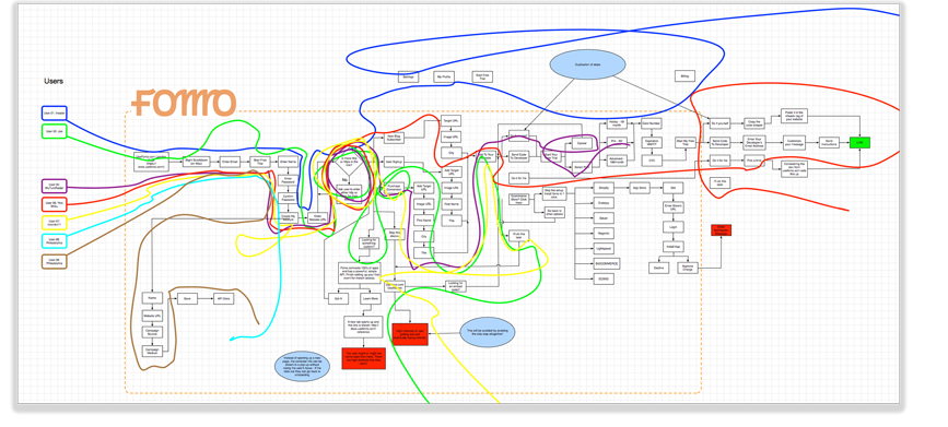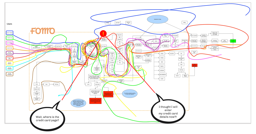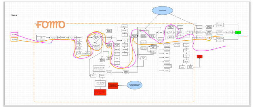 This data was great but not enough to show my research findings to the rest of the team at Fomo so I overlayed the steps these users took in Omnigraffle over the userflow I shared above to show you how and when things went wrong.